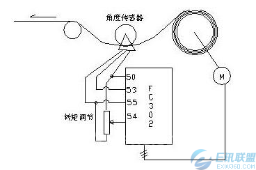 对于铝带放卷时候,其张力要求不是很严格,精度也不很高,就由摆锤压紧铝带,其中用一个角度传感器来检测其摆锤的角度大小,角度传感器的输出信号为0-5VDC。放卷的速度控制由角度控制本身输出来控制,其变频器的控制原理图如下: