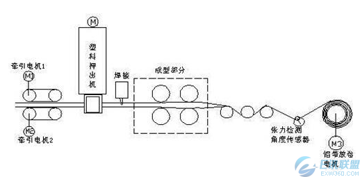 铝塑管生产线主要是由铝带放卷、成型、包胶(押出机)、成型管牵引、收卷(或者切断)。其中铝带放卷和成型管的牵引是采用由丹佛斯FC302变频器开环转矩实现的,众所周知,传动系统的运动状态满足系统的运动方程式:TM- TL=(GD2/375)*(dn/dt),式中:TM为电机的电磁转矩,TL 为生产机械的负载转矩,包含电机轴以及与轴连接的机械系统的转矩,管的张力所形成的反转矩,GD2为转动部分的转动惯量。