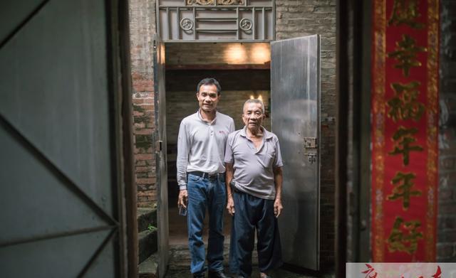 谢东祥和其父亲站在简陋的老屋前合影